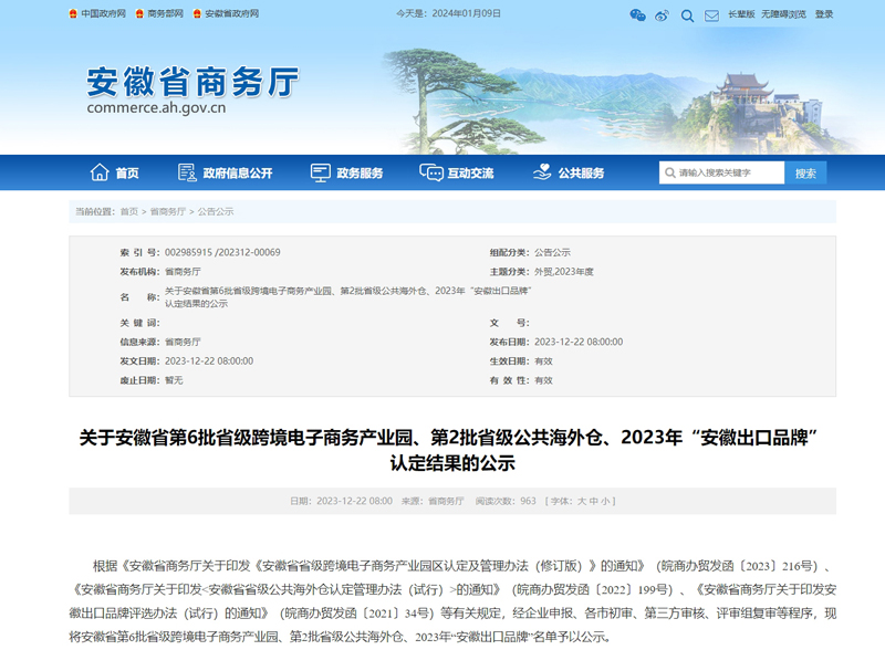 近日,安徽省商务厅公布2023年“安徽出口品牌”认定名单, 此次评选全省共44家企业,54个品牌获得认定,乐鱼leyu科技“