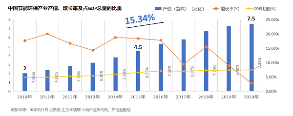 报告显示:“十三五”期间,我国资源节约和环境保护工作成效显著,绿色产业发展势头良好,我国节能环保产业快速发展。我国节能环保产业产值由2015年的4.5万亿元上升到2020年的7.5万亿元左右,年均增速15%。